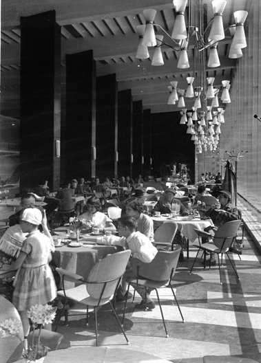 At the front, on the upper level, there is a restaurant with the original chandeliers. These chandeliers were renovated by W3 Product in compliance with their historical origin.